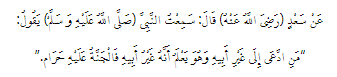 Sa'd (b. Ebû Vakkâs) (ra) diyor ki: “Hz. Peygamber'i (sav) şöyle buyururken işittim: 'Kendi babası olmadığını bile bile, babası dışında bir kimsenin oğlu olduğunu iddia eden